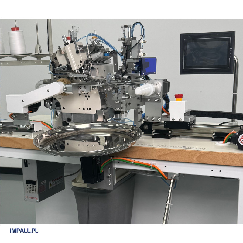 Maszyna automatycznie wprowadza ściągacz i precyzyjnie pozycjonuje pod stopką. Następnie po podłożeniu koszulki, automatycznie łączy oba elementy kontrolując i korygując równe prowadzenie materiałów. Zastosowany obrotowy talerz podtrzymujący koszulkę, minimalizuje ryzyko skręcania się i deformowania materiału.