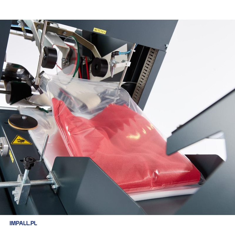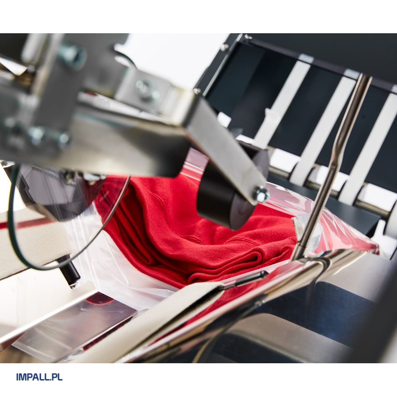 Precyzyjne pakowanie: Maszyna pakuje odzież (wcześniej złożoną przez składarkę STP1000) w worki polietylenowe (PE) oraz polipropylenowe (PP) typu „folder” (z zakładką).